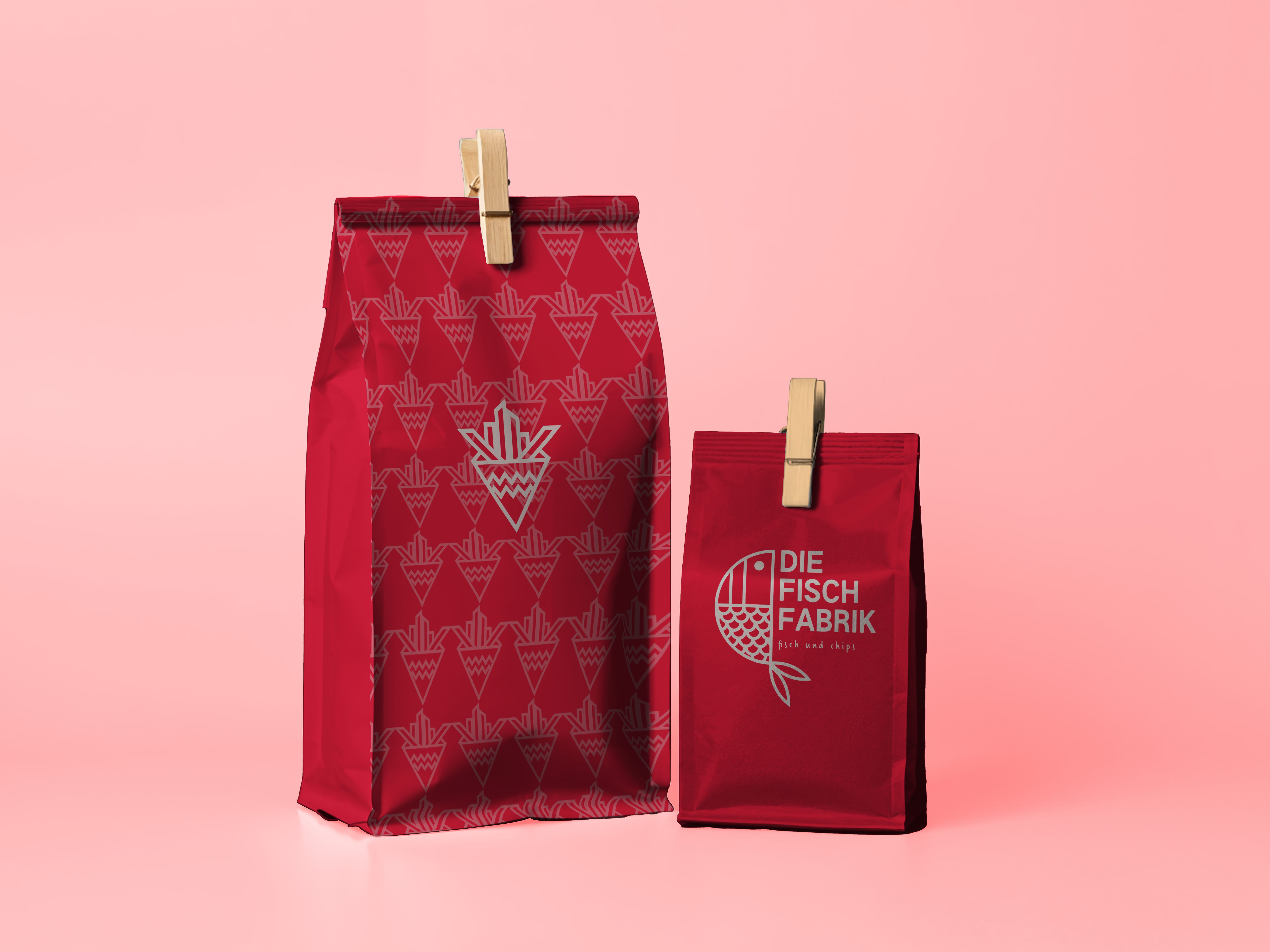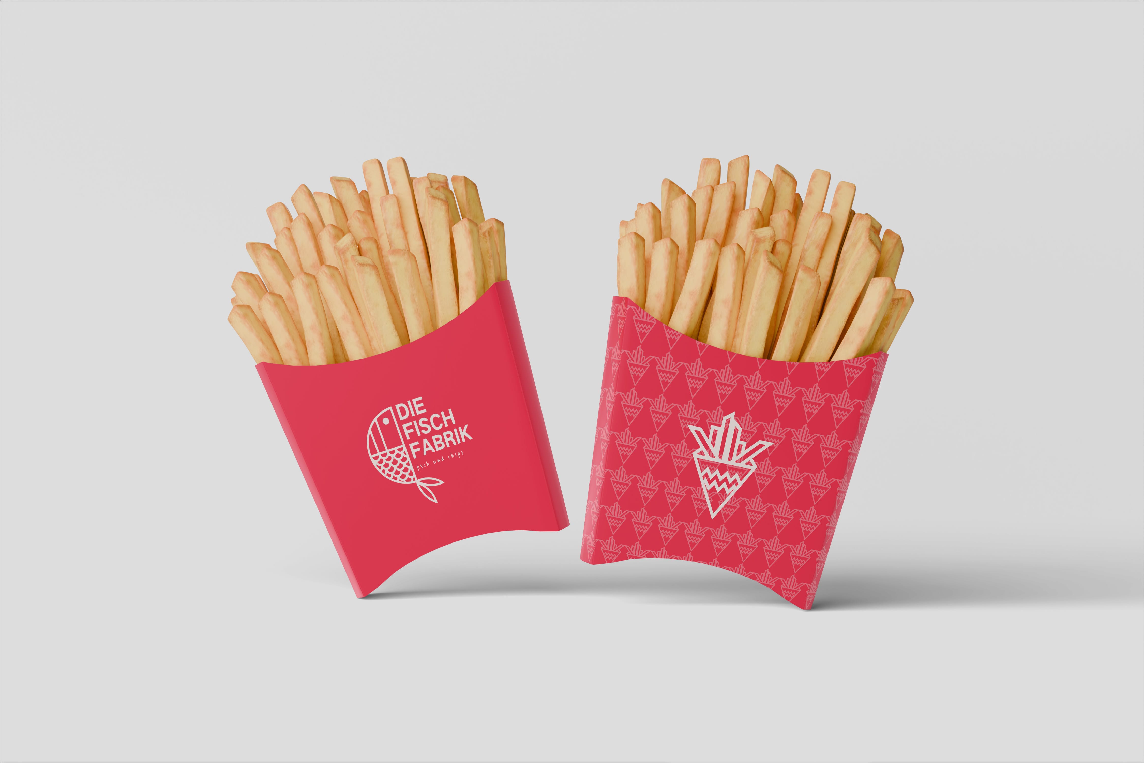 The key challenge was developing a logo that feels handcrafted, friendly, and food-related without losing clarity or recognizability. The solution: a bold emblem in a deep, saturated red, paired with a clean beige/white wordmark. The central illustration shows a stylized fish — which cleverly doubles as a headscarf, referencing hygiene and kitchen culture. This dual symbolism gives the logo a memorable twist and a unique personality. Two logo variations were designed (compact & horizontal), supported by a consistent illustrative system. The visual identity expands into packaging: • fry boxes • takeaway bags • classic cardboard containers All decorated with a pattern of transparent icons that create a lively, modern texture. The overall look is bold, fun, and unmistakably “Fischfabrik.”