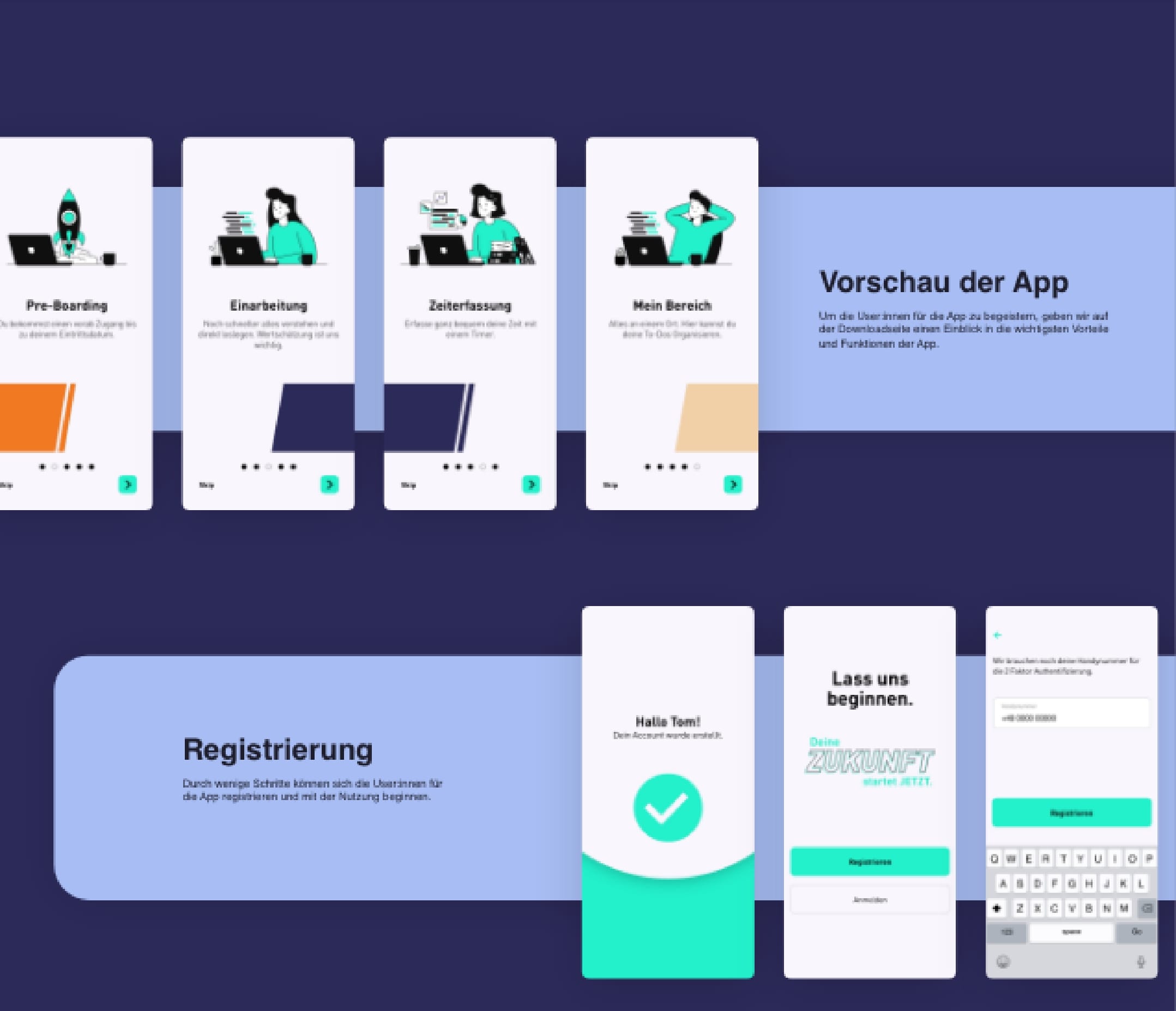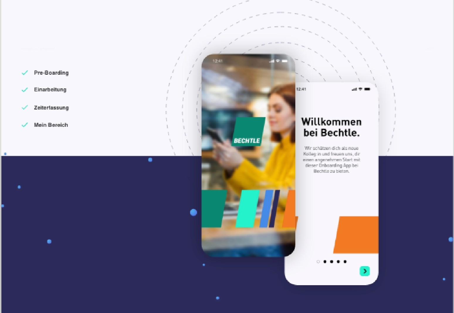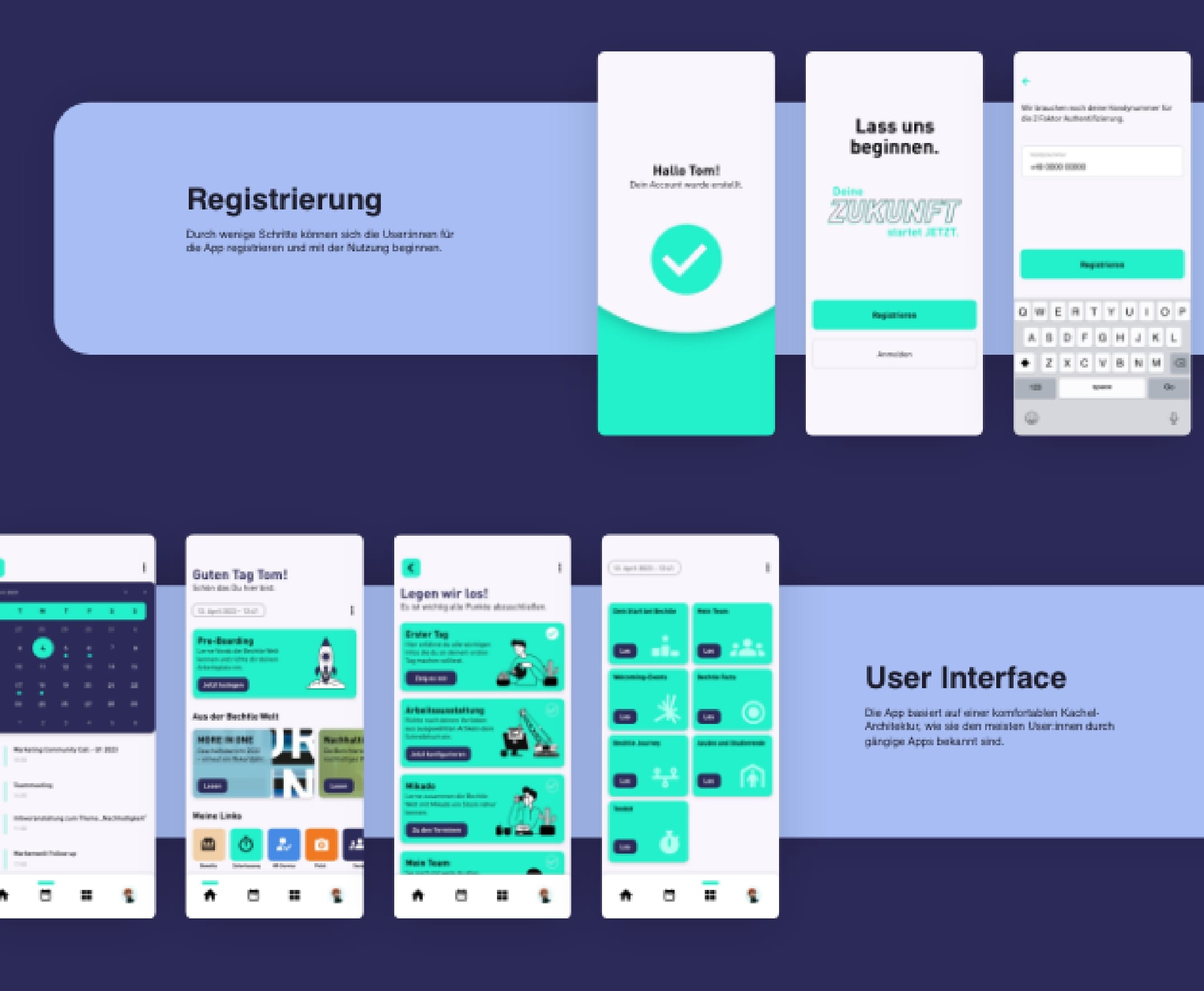 Bechtle Onboarding is a conceptual app designed to modernize the onboarding experience for new Bechtle employees. With around 100 new hires each month, the company needed a structured, user-friendly digital system that guides employees through their first days, provides clarity, and bundles all relevant information in one place.The result was the Bechtle Compass — a digital guide with a strong visual identity and a modular UX framework that supports employees step by step.