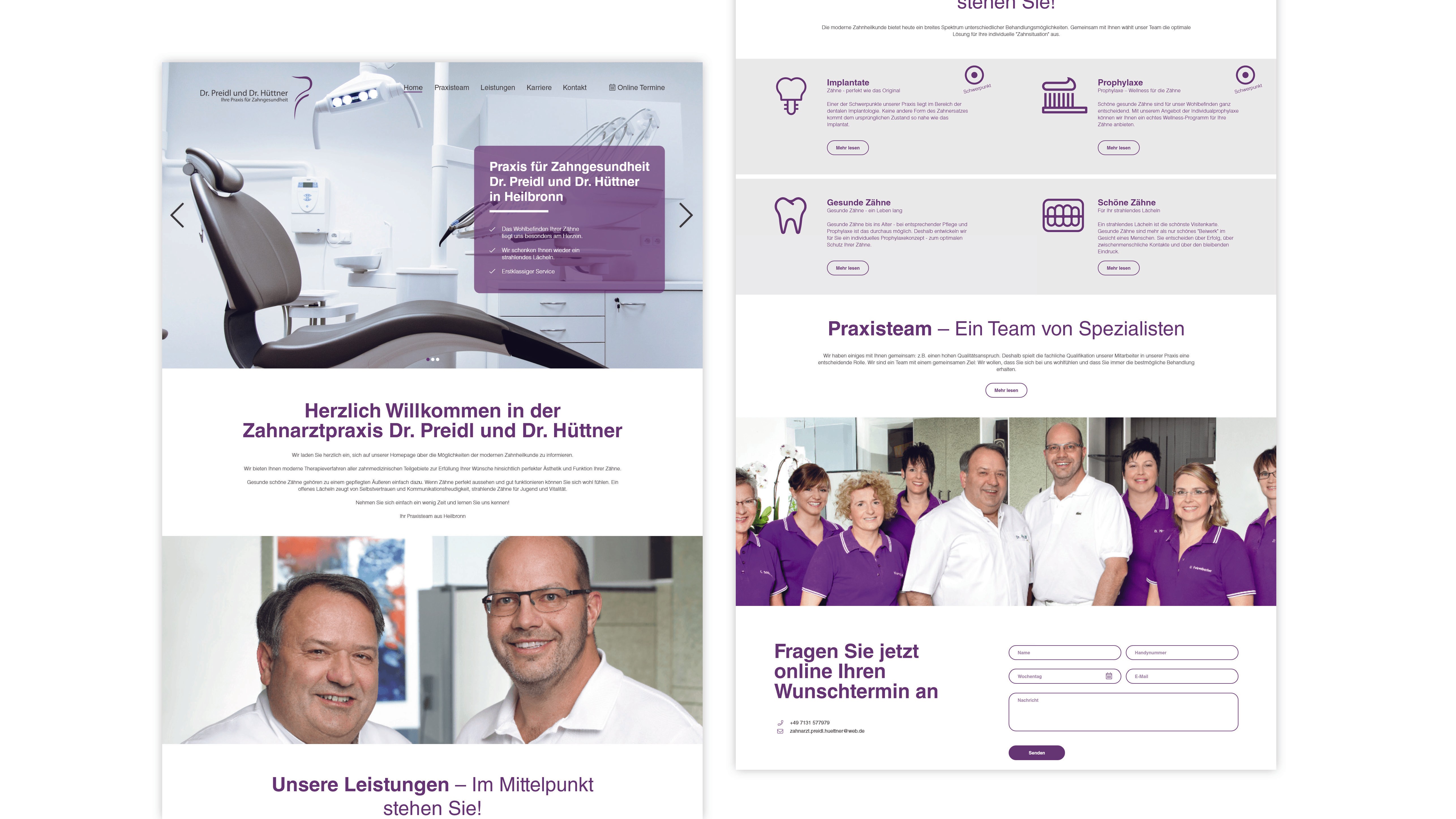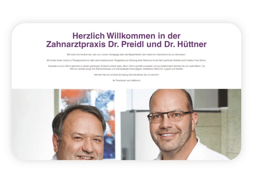 The new design focuses on a clean, fresh and welcoming look, using a bright white layout combined with the practice’s corporate color palette of lavender, light grey, and soft neutrals. A large header section featuring three rotating images — treatment chair, dental tools, and model teeth — immediately sets the medical context and creates transparency for new visitors. Key design elements included: • clear iconography for communicating treatments and services • structured content blocks for services, team presentation, and practice philosophy • friendly imagery showcasing the staff and interior • an intuitive appointment request form • embedded Google Maps for easy navigation • responsive layouts for mobile, tablet and desktop The challenge was to convey professionalism while making the experience emotionally reassuring — an important factor in healthcare design, where comfort and clarity greatly influence trust.